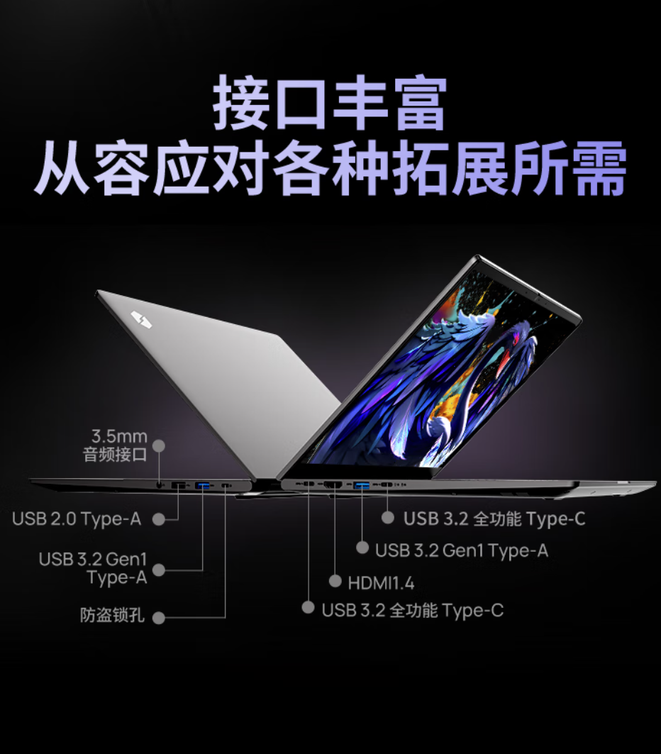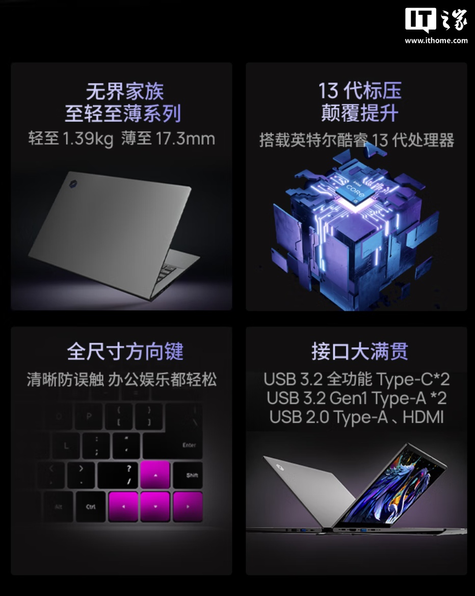 据介绍,这款笔记本搭载英特尔 13 代标压处理器,采用大小核异构设计,可满足办公、娱乐、学习场景性能,配备 CNC 工艺 Unibody 机身,C、D 两面衔接过渡更加自然,机身最薄处 17.3mm,重量 1.39kg。