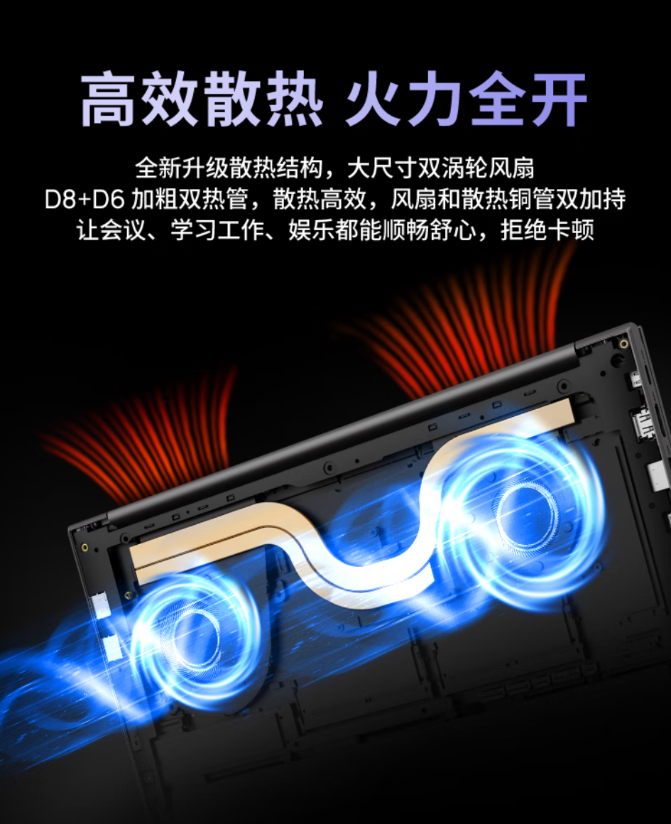 此外,这款笔记本还拥有全新升级散热架构,内置大尺寸双涡轮风扇,带有 D8+D6 两条加粗热管,号称可实现“高效散热”,配备节能模式、平衡模式、性能模式三种散热场景,只需按下 Fn+X 键就能切换,配备 65W 电源适配器,摄像头拥有物理开关,可保护隐私。